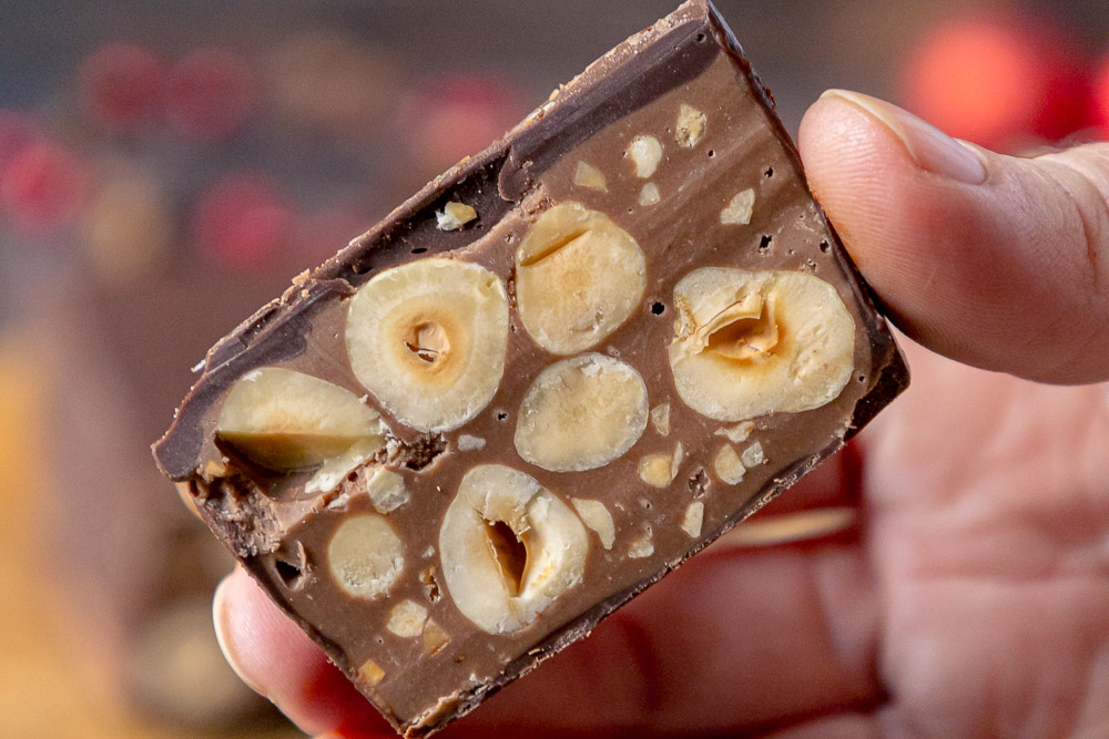Anche la colata nello stampo aveva un ritmo suo. Nulla era fatto in fretta. La nonna spingeva il composto con il dorso del cucchiaio, livellava piano e lasciava che il torrone si accomodasse da solo. Nessuna pressione e nessuna forzatura, perché il cioccolato deve trovare il proprio spazio. Questo passaggio, oggi spesso ignorato, incide molto sulla morbidezza finale. L’aroma aumentava ancora di più grazie all’ultimo gesto: avvolgere lo stampo in un canovaccio caldo. Un’abitudine strana a prima vista, ma che proteggeva il torrone dagli sbalzi di temperatura e favoriva una struttura più omogenea. Dopo mezza giornata di riposo, il torrone usciva compatto e il taglio diventava un momento quasi rituale. Ogni fetta mostrava la frutta secca distribuita in modo naturale, senza accumuli, e il profumo di cioccolato al latte restava pieno e rotondo.